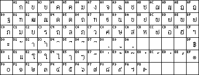The Thai TIS620 is likely to be published as ISO-8859-11 Latin/Thai (th). It contains some combining vowel and tone marks that have to be written above or below the consonants.