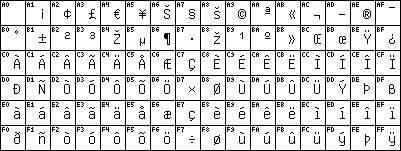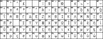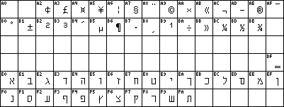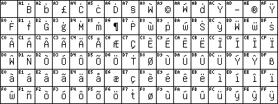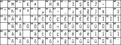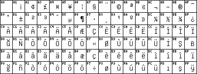 The following bitmap GIFs show only the upper G1 portions of the respective charsets. Characters 0 to 127 are always identical with US-ASCII and the positions 128 to 159 hold some less used control characters: the so-called C1 set from ISO 6429.