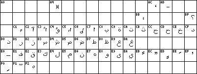 This is the Arabic alphabet, unfortunately the basic alphabet for the Arabic (ar) language only and not containing the four extra letters for Persian (fa) nor the eight extra letters for Pakistani Urdu (ur). This fixed font is not well-suited for text display. Each Arabic letter occurs in up to four (2²) presentation forms: initial, medial, final or separate. To make Arabic text legible you'll need a display engine that analyses the context and combines the appropriate glyphs on top of a handler for the reverse writing direction shared with Hebrew. The rendering algorithm is described in the Unicode book and I have implemented it in my arabjoin perl script.